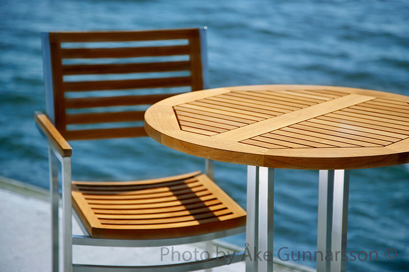 Sitta uteAv admin / 2010-08-11 Bord och stol ur serien Praga från Formlagret Äntligen tittar solen fram och vi fotograferar läckra utemöbler på en brygga i Hägernäs.